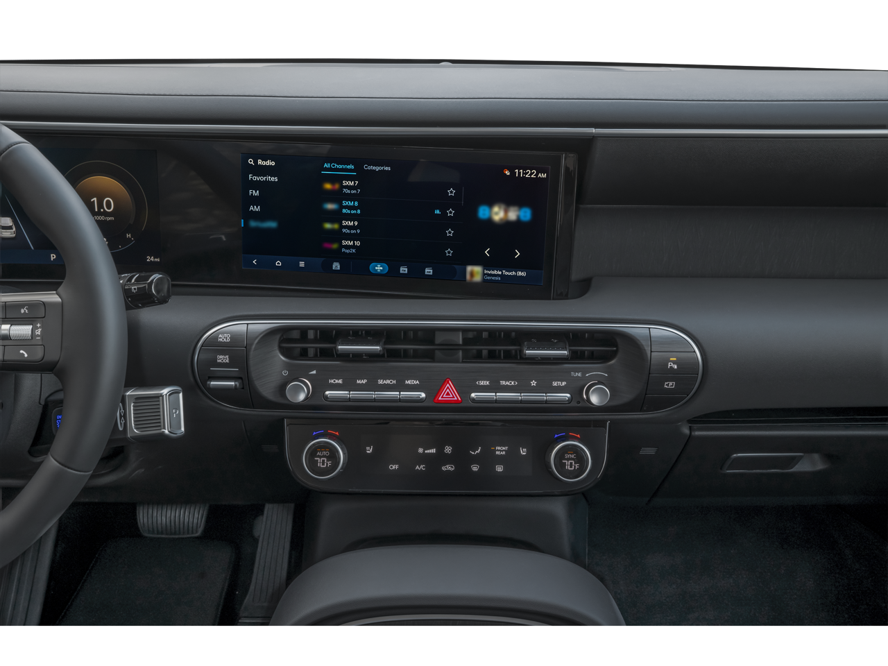 - Radio: Infotainment Navigation System -inc: 12.3" color touchscreen, wireless Apple CarPlay and Android Auto, HD Radio, Sirius XM, Passenger Talk 2.0 in-car intercom system, dynamic voice recognition, rear seat quiet mode, Bluetooth® hands-free w/wireless audio streaming, multiple device connection (up to 2 devices), USB connectivity, Bluelink + connected car services, Wi-Fi hotspot, steering wheel audio controls and Over-the-Air (OTA) software updates